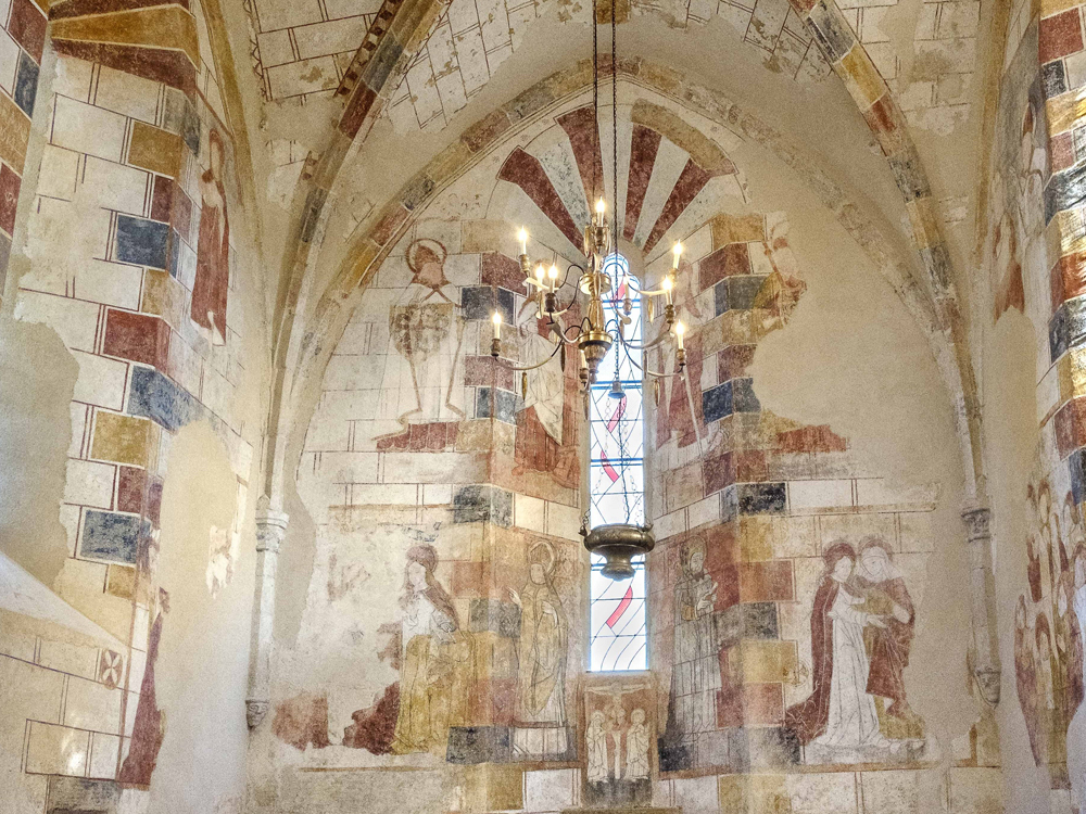 Facture d’exécution : peintures murales à détrempe sur mortier de chaux, datant du XIVe au XVIe siècle